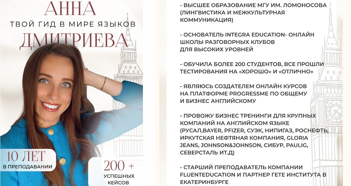 800 р. за первое посещение разговорного клуба, 1250 р. за индивидуальное занятие